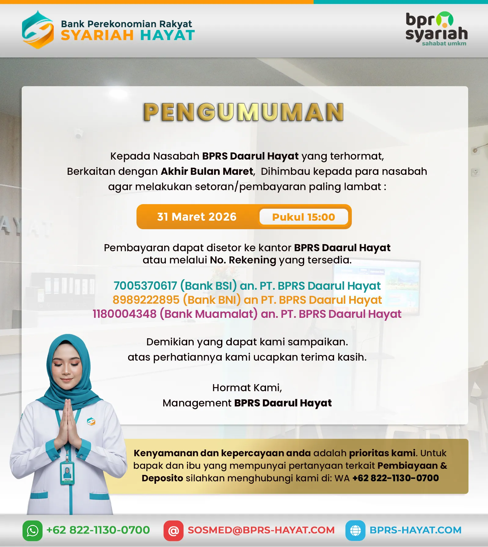 Terima kasih telah mempercayakan kebutuhan finansial Anda kepada kami. BPR Syariah Hayat berkomitmen untuk melayani dengan kepercayaan, amanah, dan profesionalisme, serta menghadirkan solusi keuangan yang adil dan transparan.