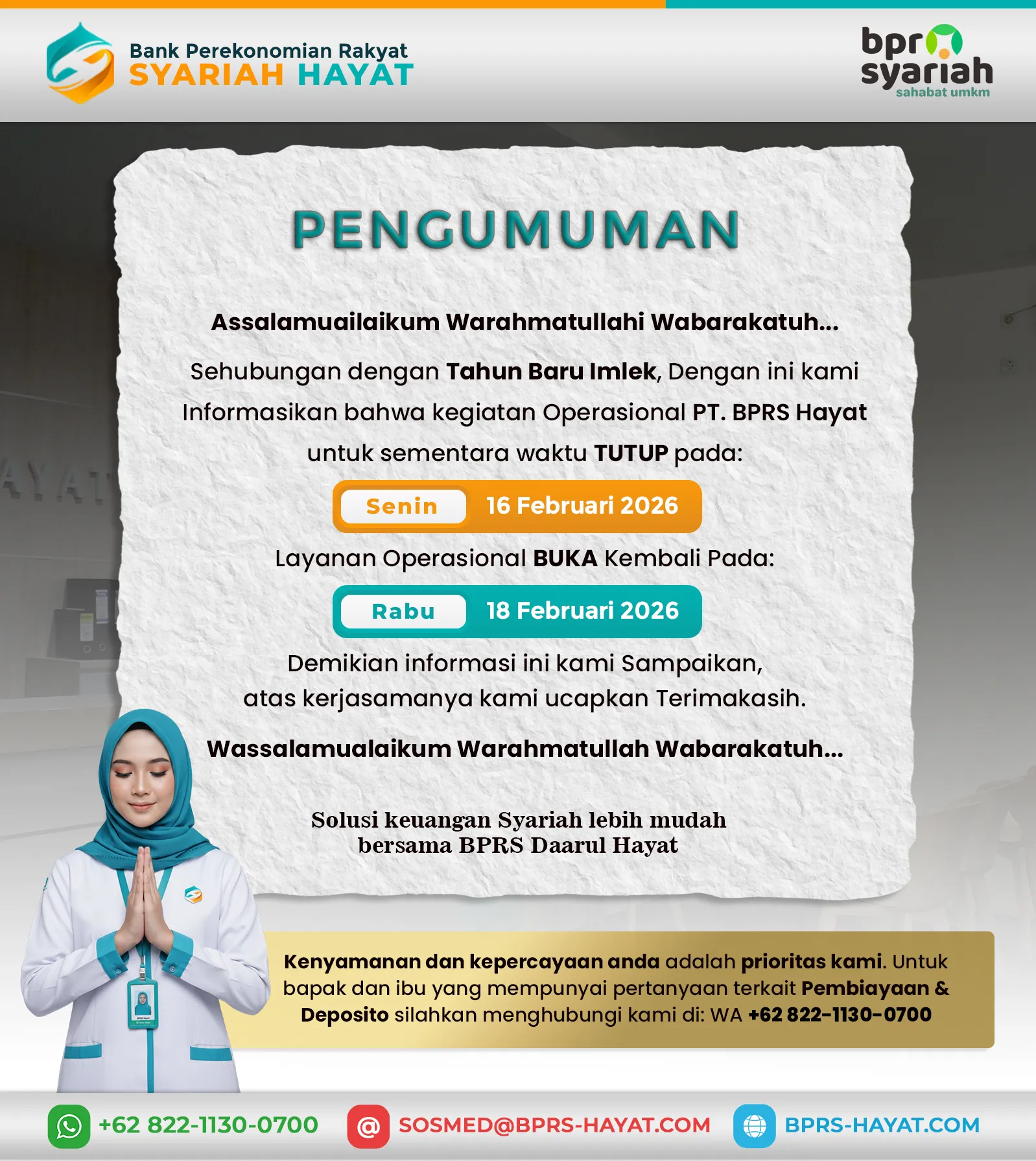 Terima kasih telah mempercayakan kebutuhan finansial Anda kepada kami. BPR Syariah Hayat berkomitmen untuk melayani dengan kepercayaan, amanah, dan profesionalisme, serta menghadirkan solusi keuangan yang adil dan transparan.
