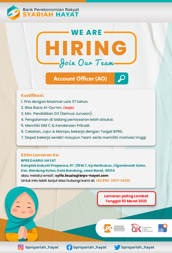 Dipersilahkan mengirim CV berserta file pendukung nya ke syifa.fauzia@bprs-hayat.com